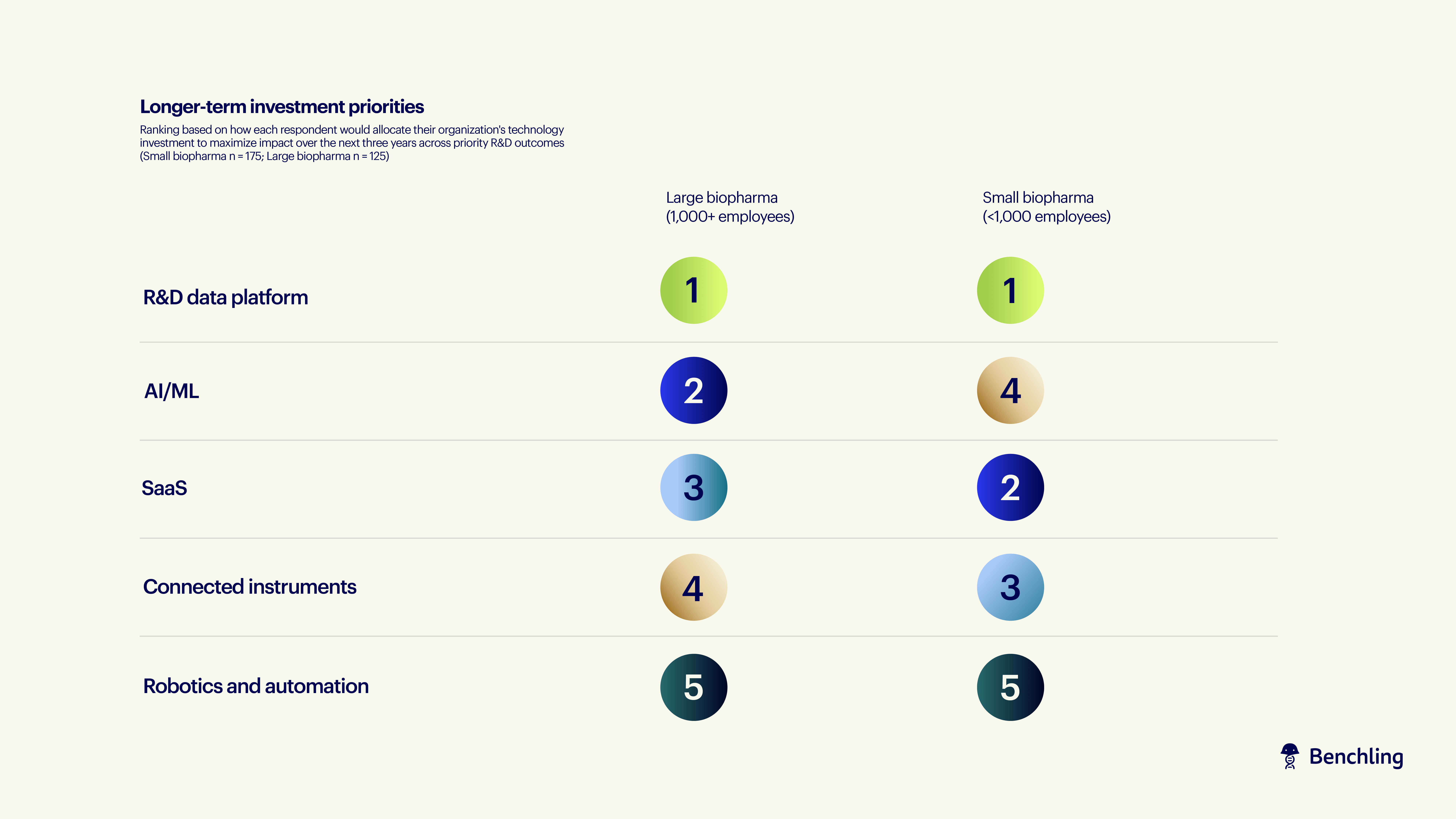 AI’s full impact on drug discovery and the R&D lifecycle is still emerging, but large biopharma isn’t taking a wait-and-see approach. In this report, respondents at large companies adopt AI/ML at nearly three times the rate of small biopharma (67% vs. 23%) and rank it as their second-highest investment priority over the next three years, just behind R&D data platforms.